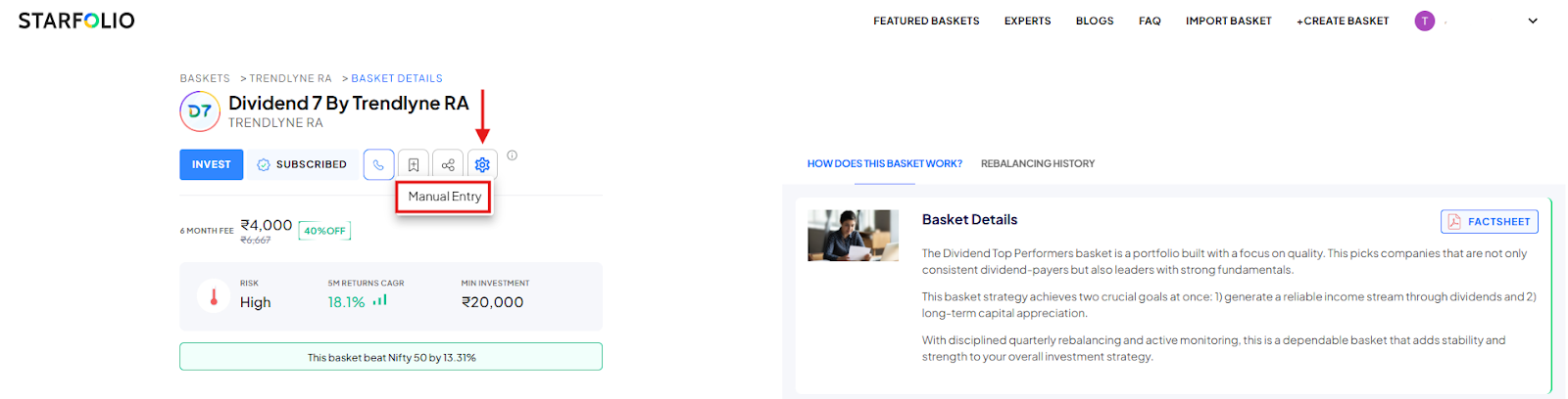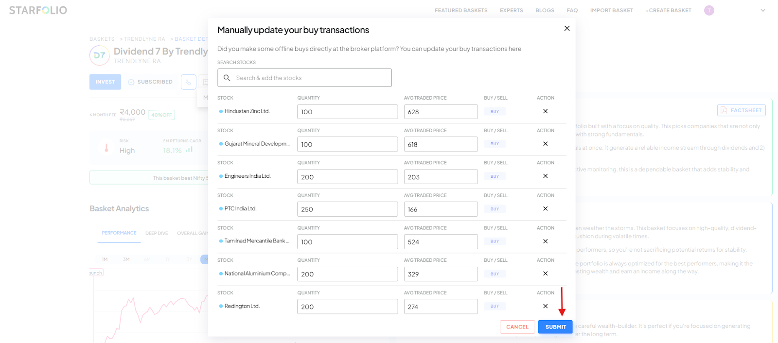 After placing trades directly with your broker, you can manually add your transactions by following the steps below, as shown in the image for the Dividend 7 by Trendlyne RA basket: