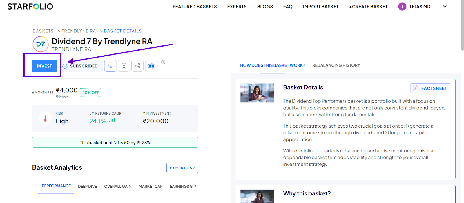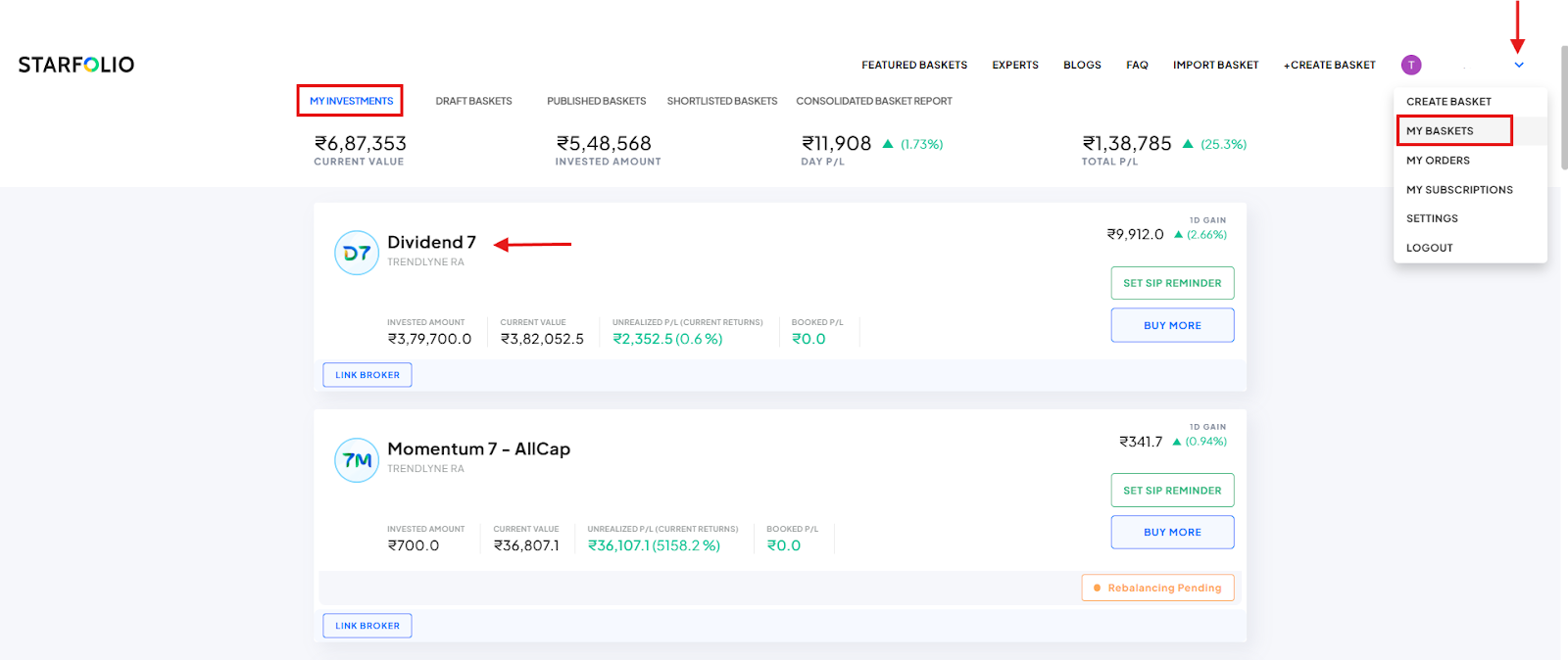 Once the transactions are added, you will be able to track your investments and performance on My Baskets page.