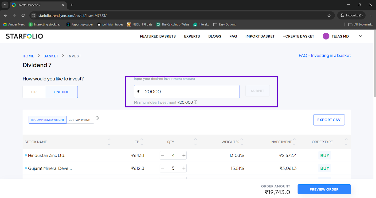 2. You will see the basket constituents along with suggested quantities based on the minimum investment amount.